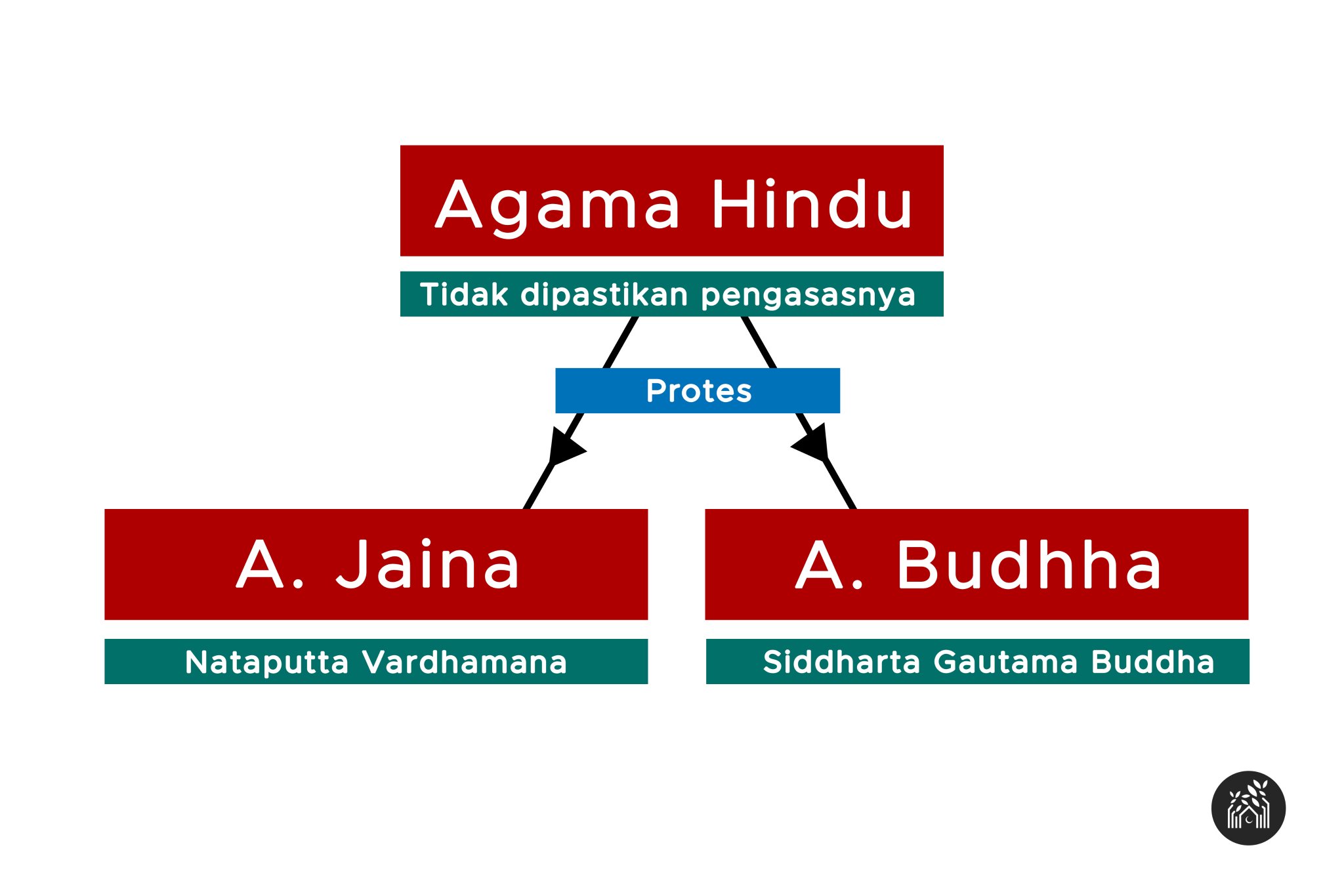 Siddharta sendiri tidak pernah berbicara tentang tuhan namun akhinya dia sendiri yang dianggap memiliki unsur ketuhanan. Diasaskan oleh Siddharta Gautama Memberi tumpuan kepada aspek etika dan moral Doktrin ajaran Buddha tentang Dhamma dirangkumkan dalam Empat Kebenaran Mulia. Sementara agama Jaina pula diasaskan oleh Nata-Putta Vardhamana yang terkenal dengan Mahavira 599SM-527SMbermaksud pahlawan besar dan merupakan anak kepada seorang.